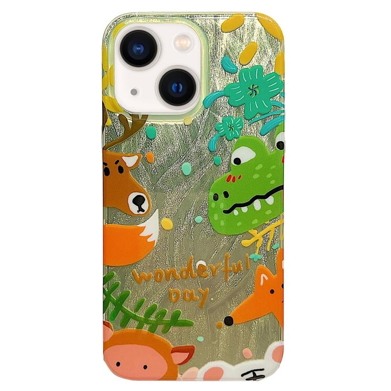 For iPhone 13 Double Sided IMD Full Coverage TPU Phone Case(Green Dinosaur Fox Tail)