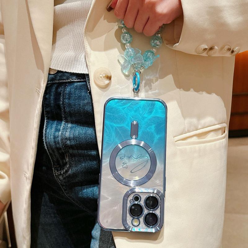 For iPhone 13 Dual-Love Feather Gradient Glitter Bracelets Magsafe TPU Phone Case(Blue)
