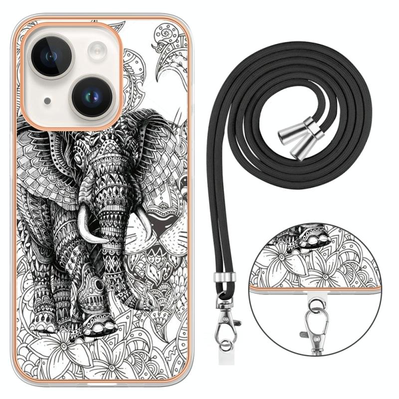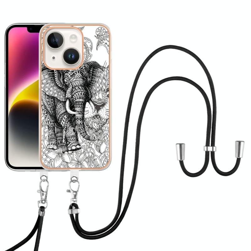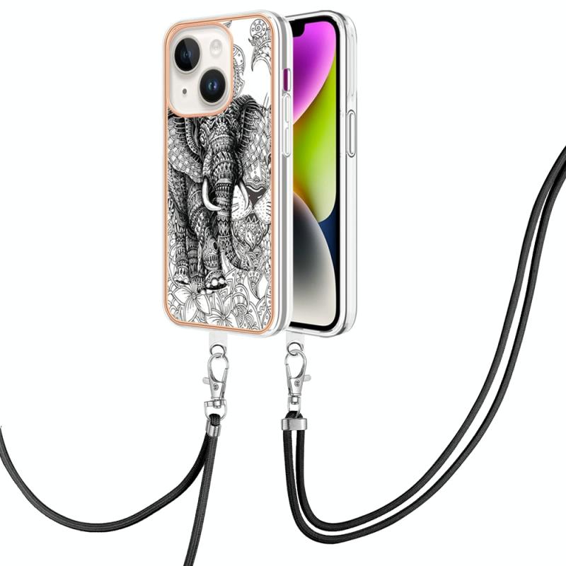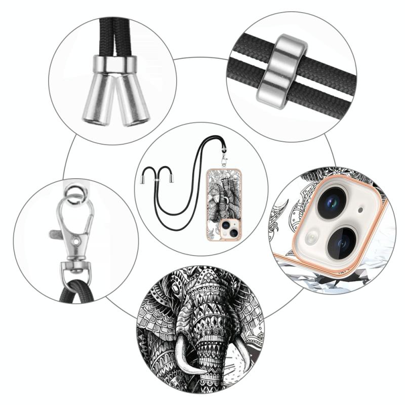 For iPhone 13 Electroplating Dual-side IMD Phone Case with Lanyard(Totem Elephant)