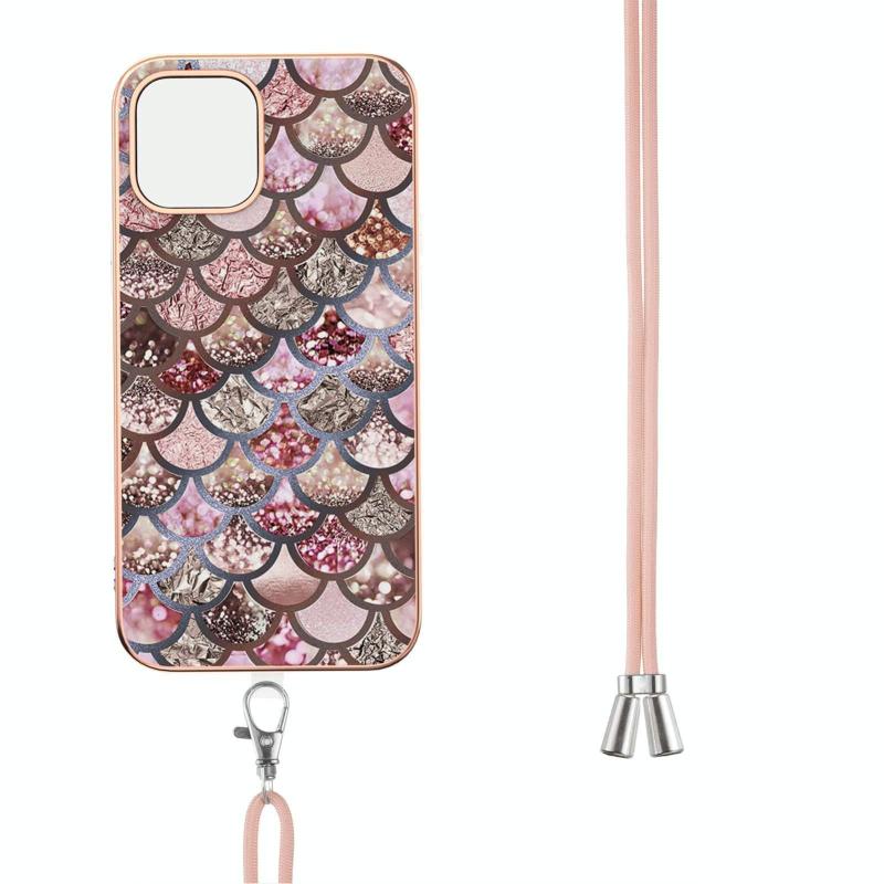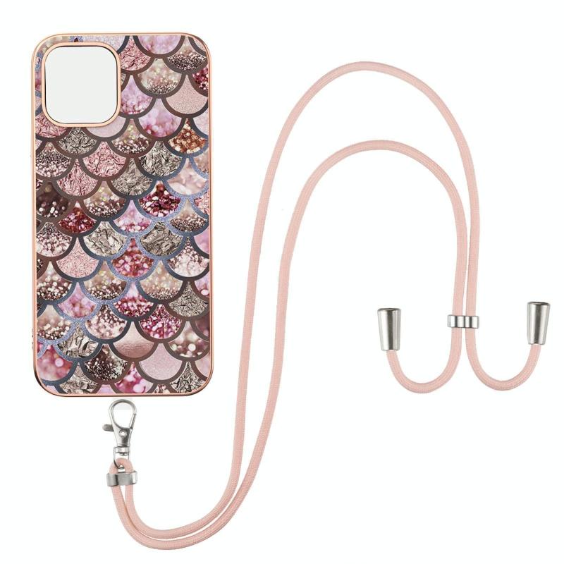 For iPhone 13 Electroplating Pattern IMD TPU Shockproof Case with Neck Lanyard(Pink Scales)