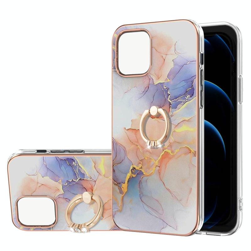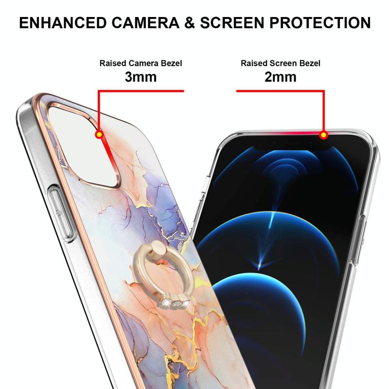 For iPhone 13 Electroplating Pattern IMD TPU Shockproof Case with Rhinestone Ring Holder(Milky Way White Marble)