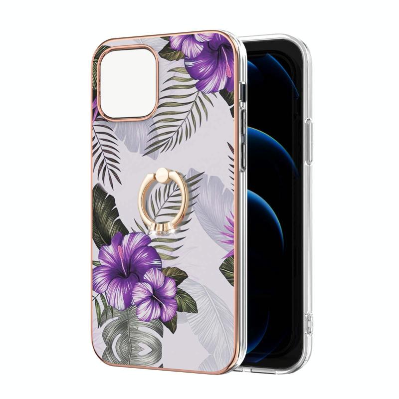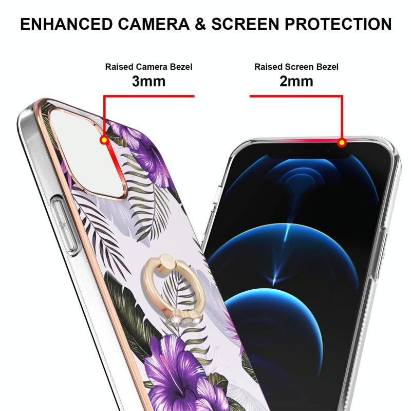 For iPhone 13 Electroplating Pattern IMD TPU Shockproof Case with Rhinestone Ring Holder(Purple Flower)