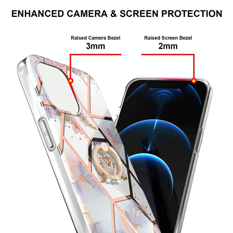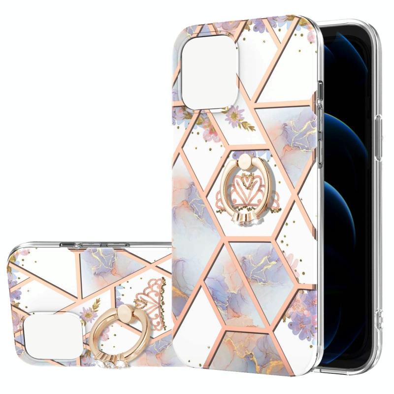 For iPhone 13 Electroplating Splicing Marble Flower Pattern TPU Shockproof Case with Rhinestone Ring Holder(Imperial Crown)