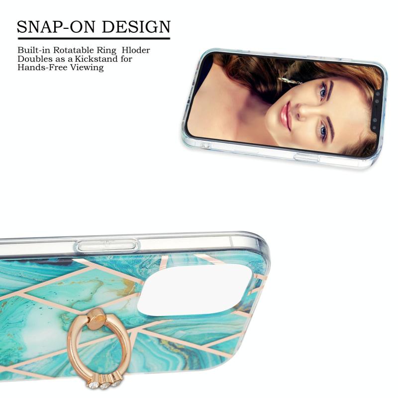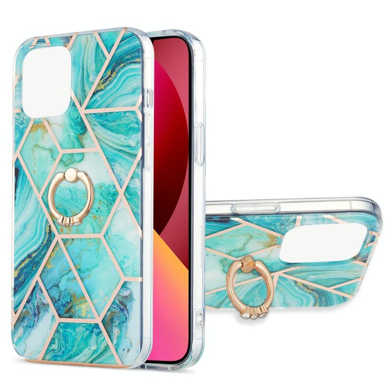 For iPhone 13 Electroplating Splicing Marble Pattern Dual-side IMD TPU Shockproof Case with Ring Holder(Blue)