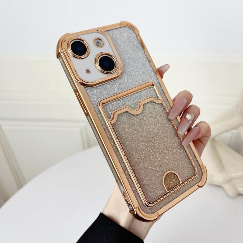 For iPhone 13 Four-cornered Glitter Electroplated Card Bag TPU Phone Case(Gold)