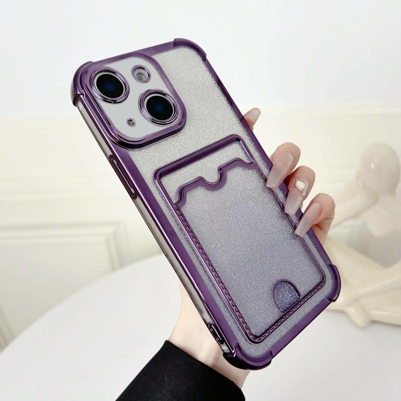 For iPhone 13 Four-cornered Glitter Electroplated Card Bag TPU Phone Case(Purple)