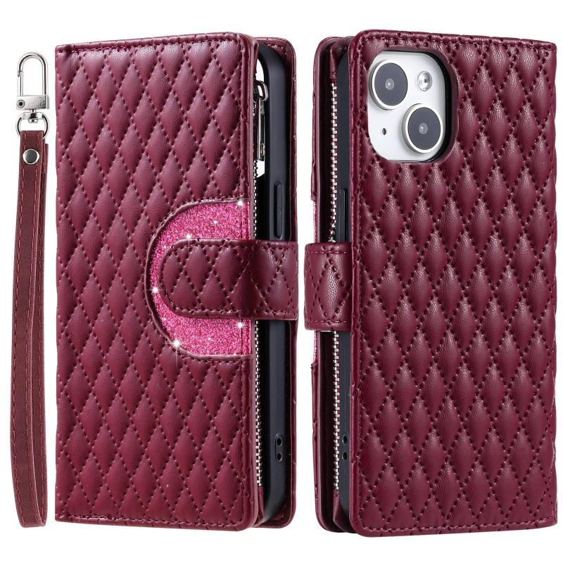 For iPhone 13 Glitter Lattice Zipper Wallet Leather Phone Case(Wine Red)