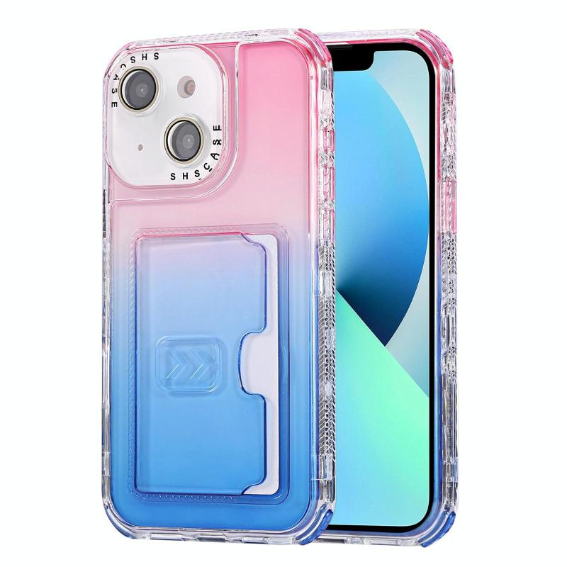 For iPhone 13 Gradient 3-in-1 Card Bag TPU Shockproof Phone Case(Pink Blue)