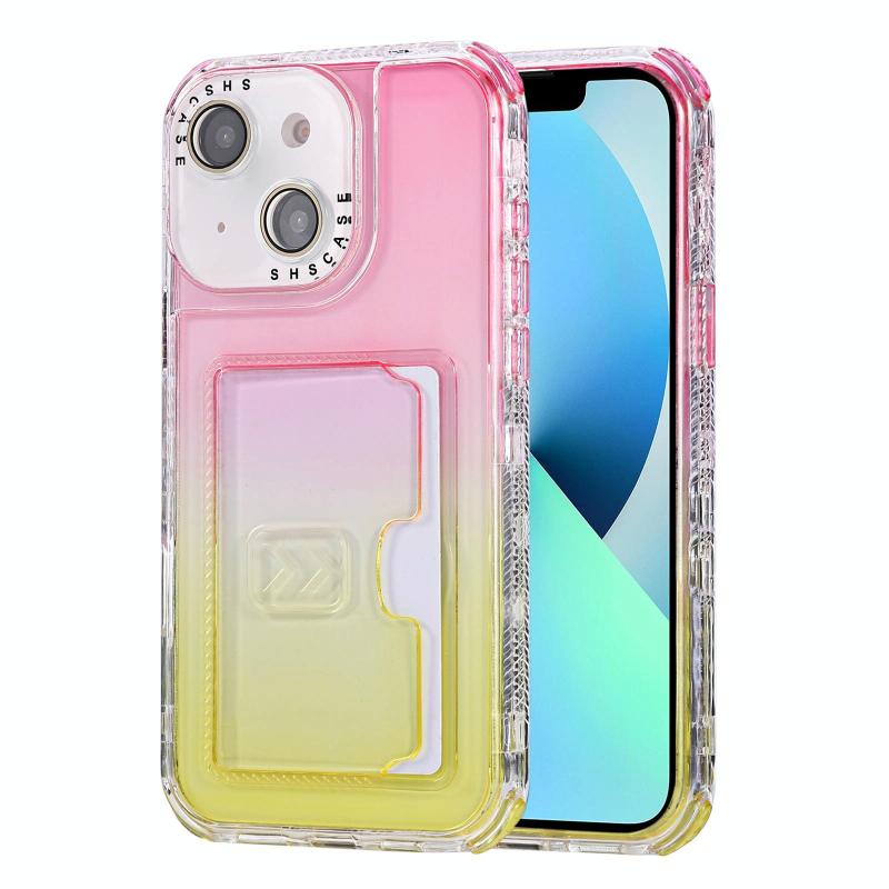 For iPhone 13 Gradient 3-in-1 Card Bag TPU Shockproof Phone Case(Pink Yellow)