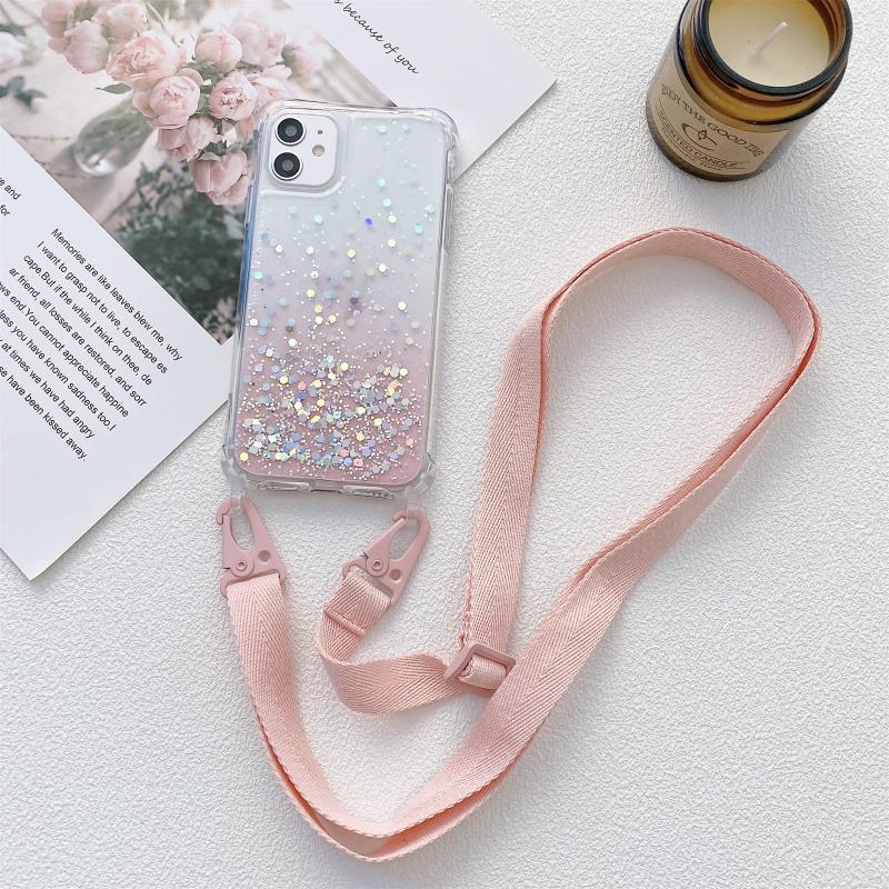 For iPhone 13 Gradient Glitter Powder Epoxy TPU Thickened Acrylic Shockproof Case with Wide Neck Lanyard(Pink)