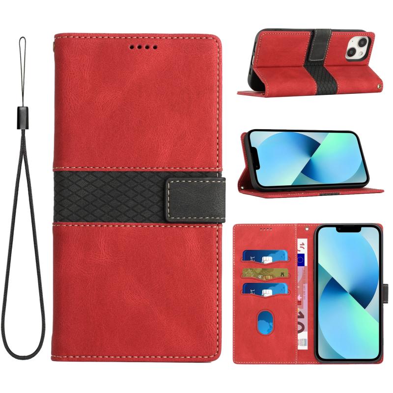 For iPhone 13 Grid Stitching Leather Phone Case with Lanyard(Red)