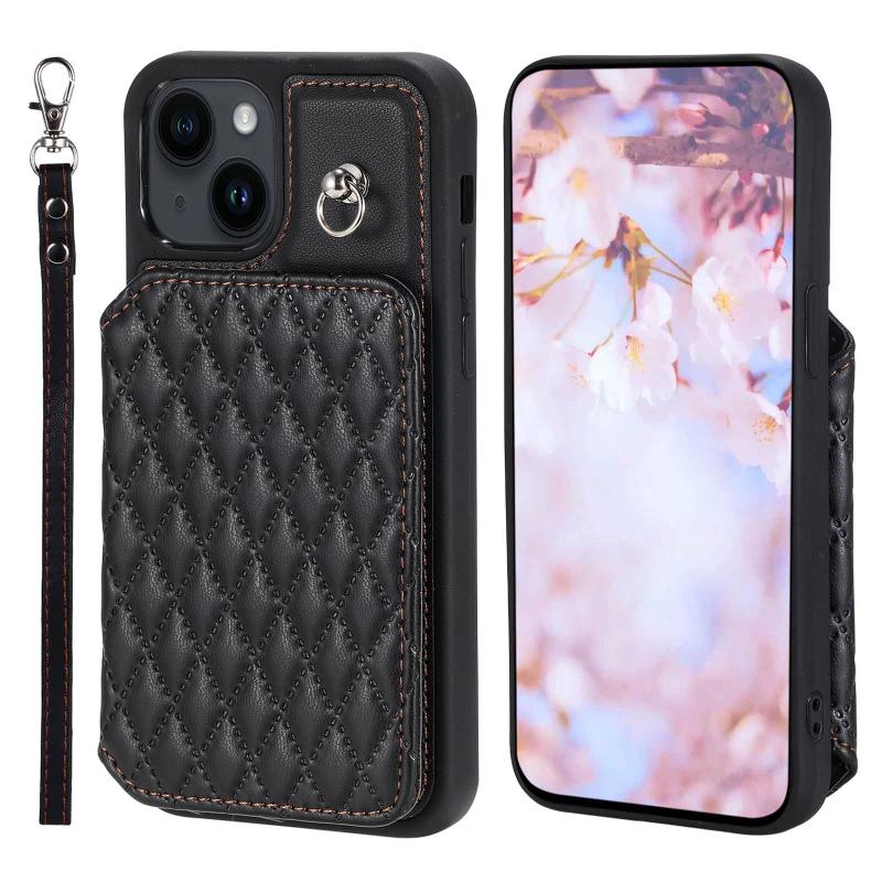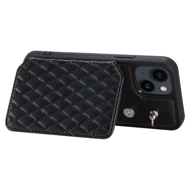 For iPhone 13 Grid Texture Card Bag Phone Case with Lanyard(Black)