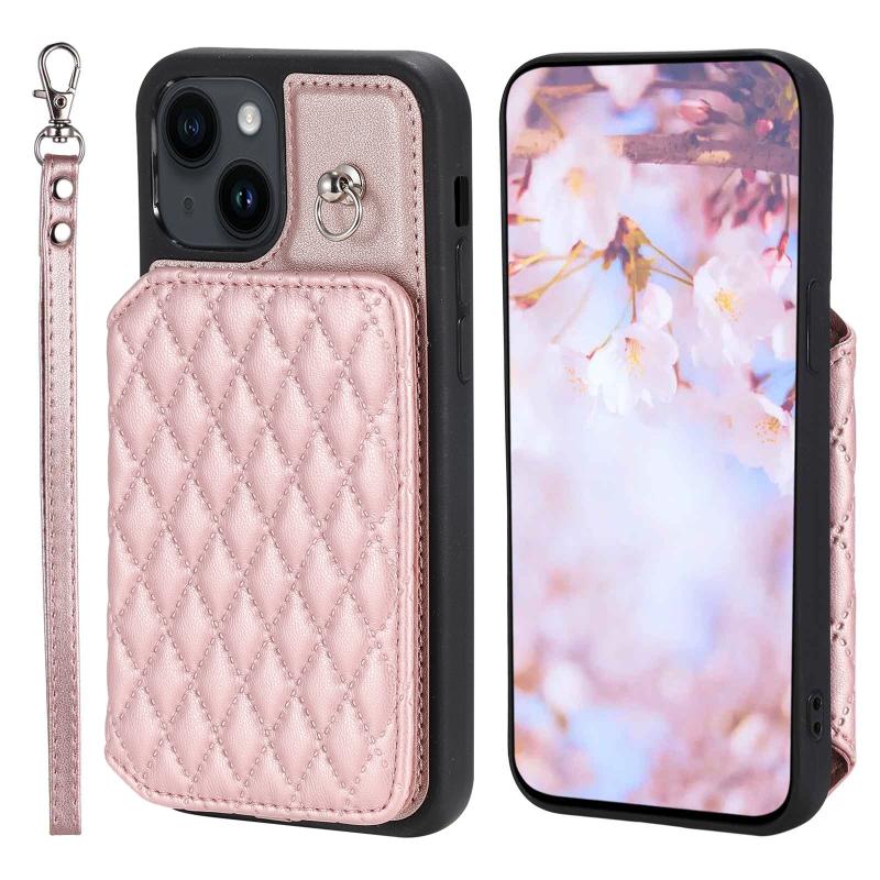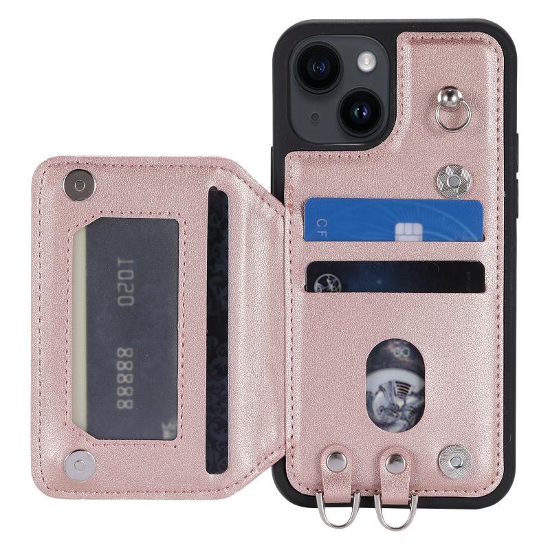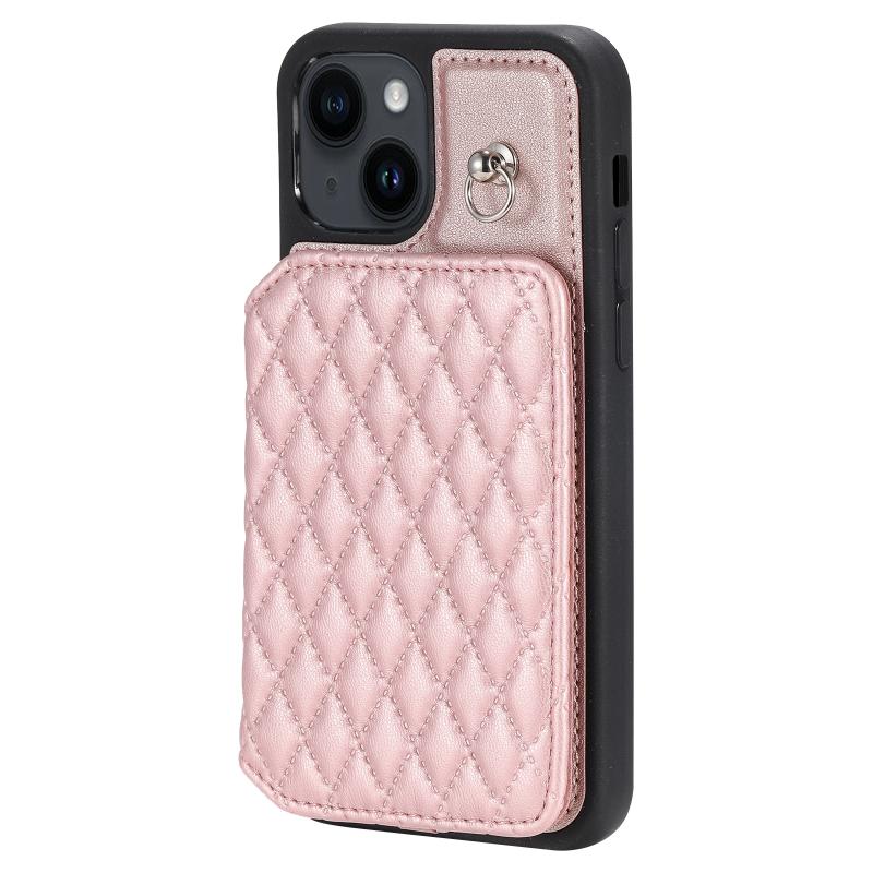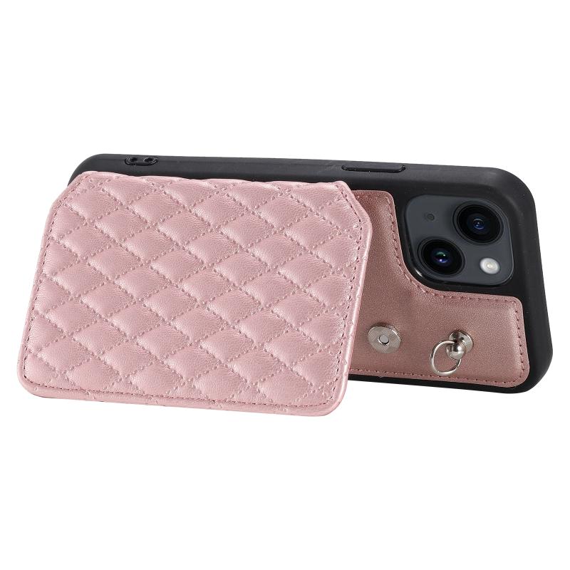 For iPhone 13 Grid Texture Card Bag Phone Case with Lanyard(Rose Gold)