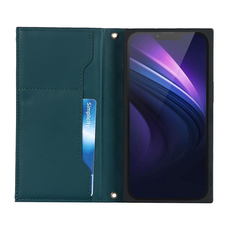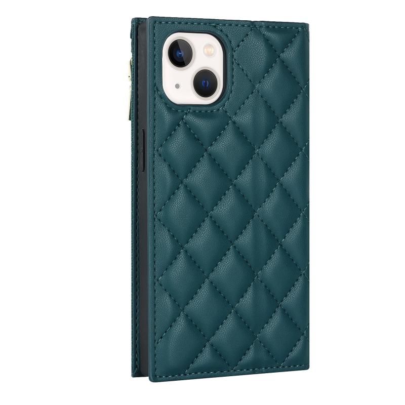 For iPhone 13 Grid Texture Lanyard Zipper Leather Phone Case(Green)