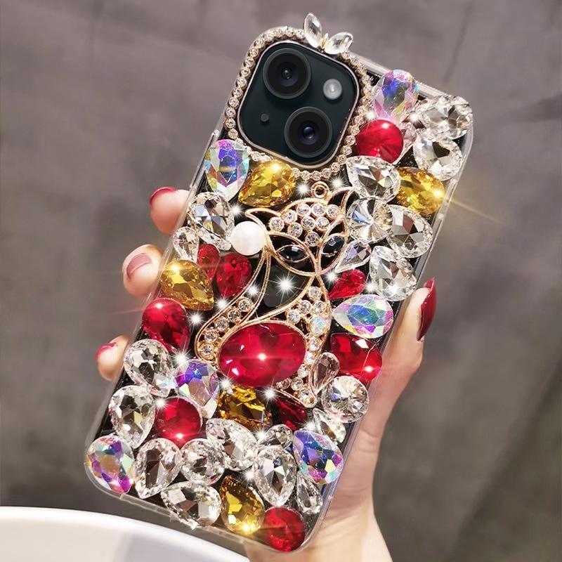 For iPhone 13 Handmade Bling Rhinestone Gemstone Fox PC Phone Case(Red)