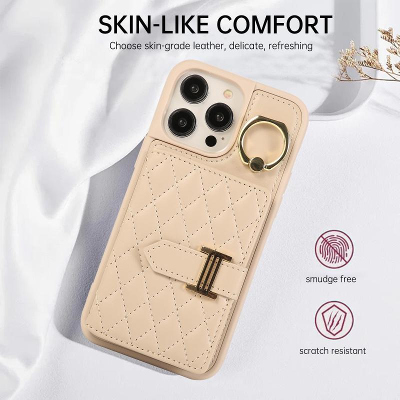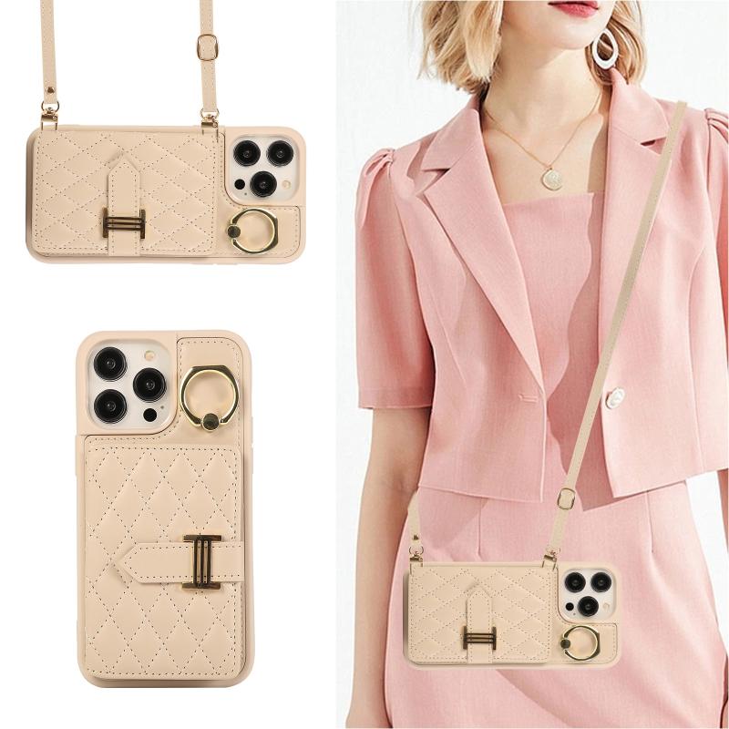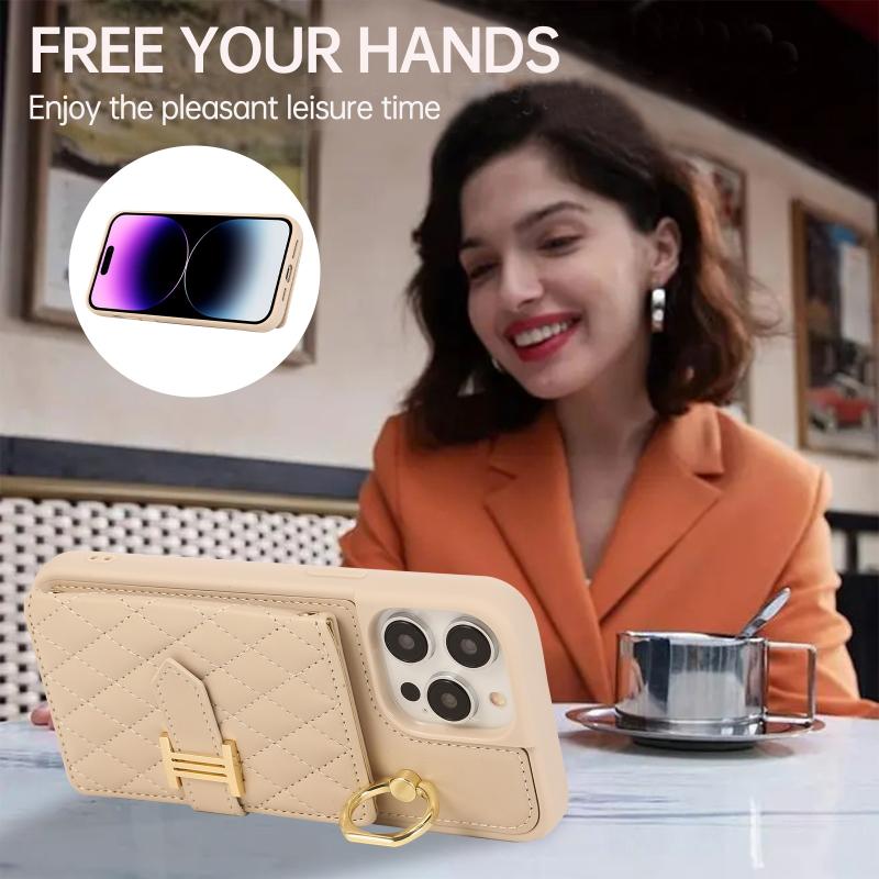 For iPhone 13 Horizontal Card Bag Ring Holder Phone Case with Dual Lanyard(Beige)