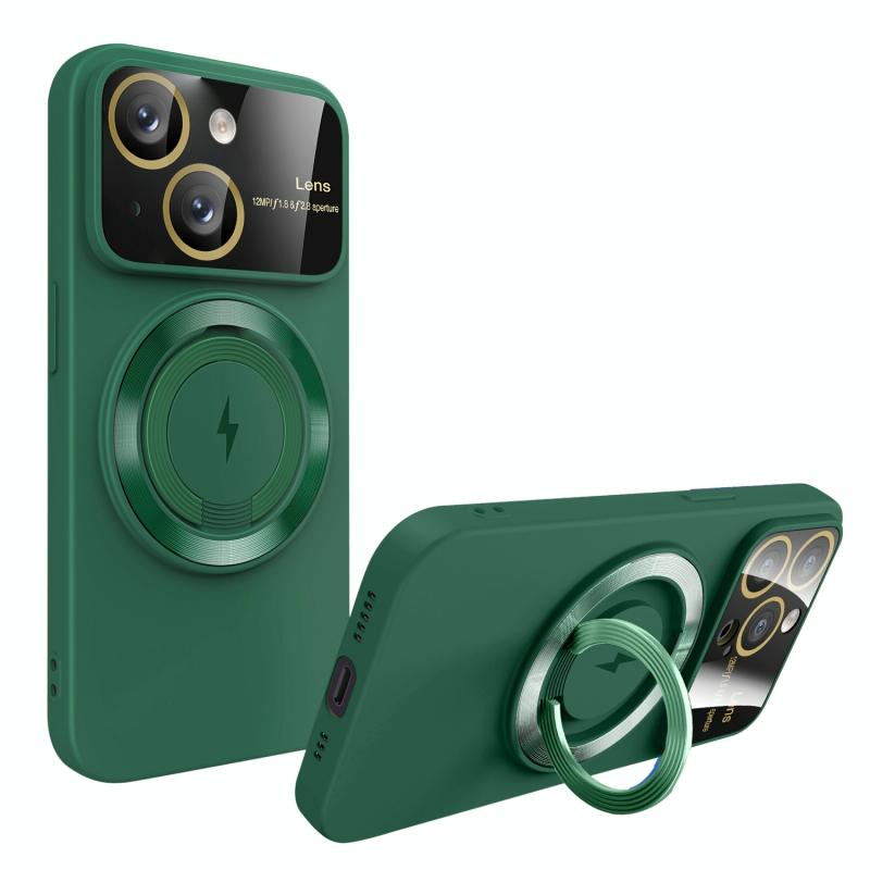 For iPhone 13 Large Window MagSafe Magnetic Holder Phone Case(Dark Green)