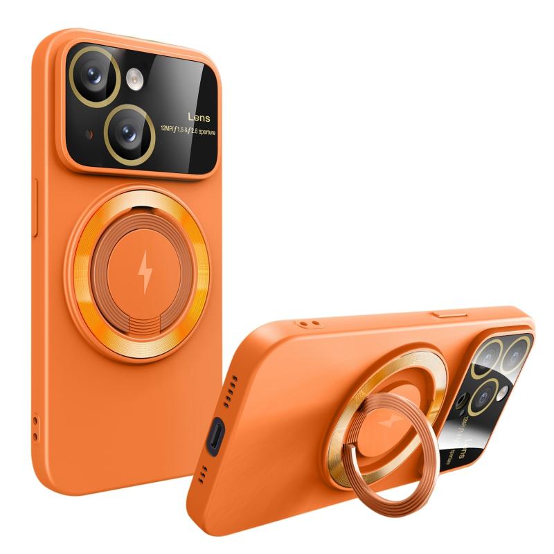 For iPhone 13 Large Window MagSafe Magnetic Holder Phone Case(Orange)
