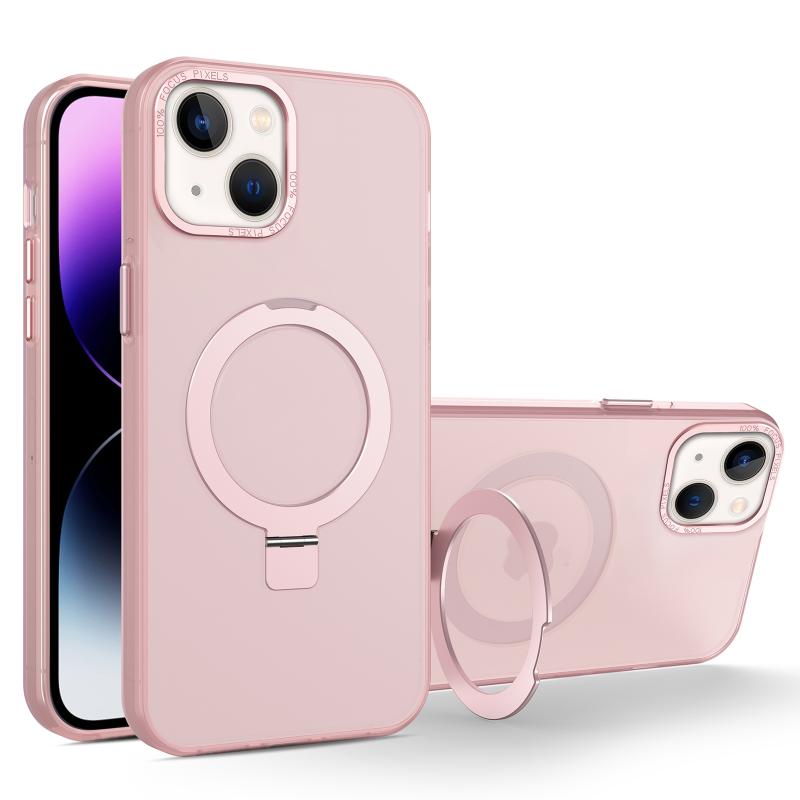 For iPhone 13 MagSafe Metal Holder Frosted Translucent Phone Case(Pink)
