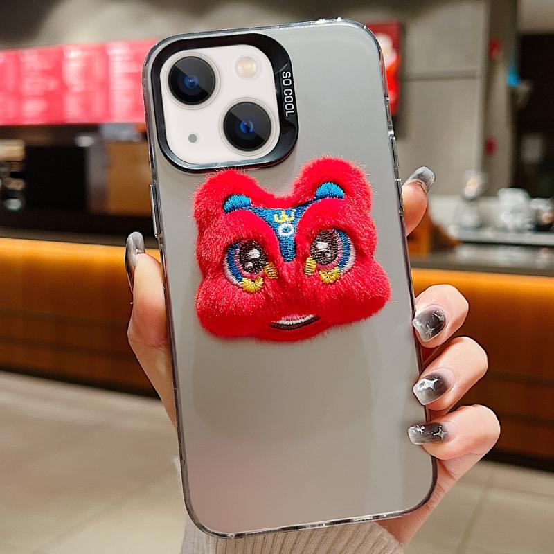 For iPhone 13 New Year Lion Dance Plush Doll Phone Case(Grey Back Red Lion)