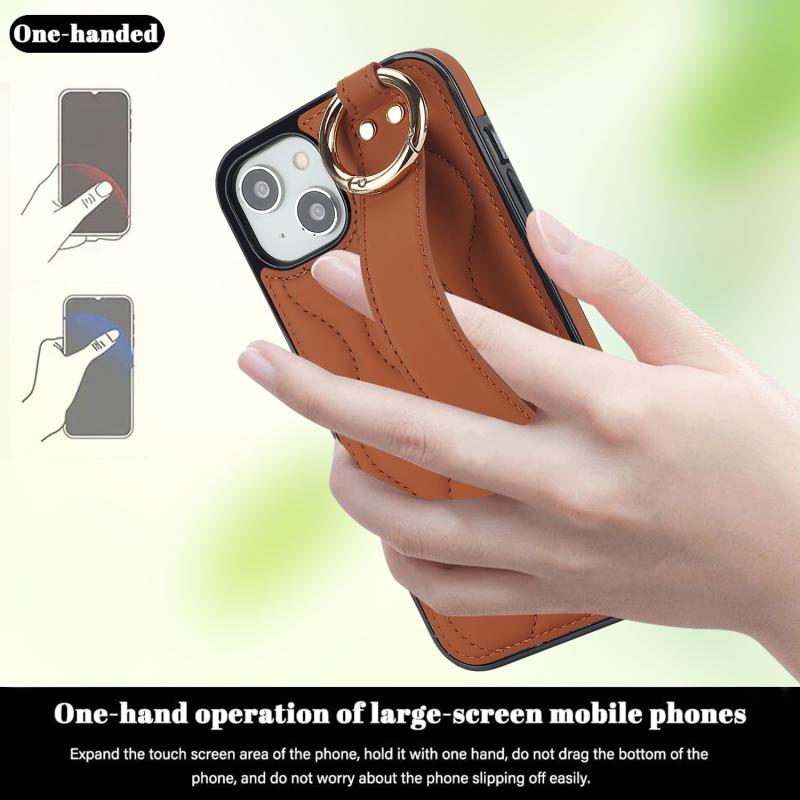 For iPhone 13 Non-slip Full Coverage Ring PU Phone Case with Wristband(Brown)