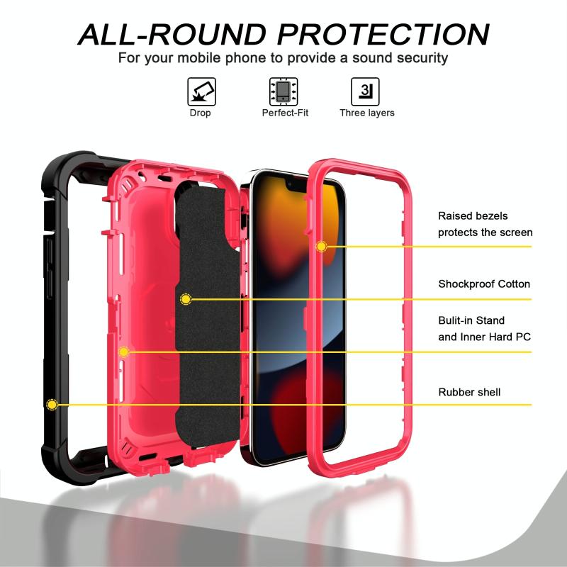 For iPhone 13 PC + Rubber 3-layers Shockproof Protective Case with Rotating Holder(Black + Rose Red)