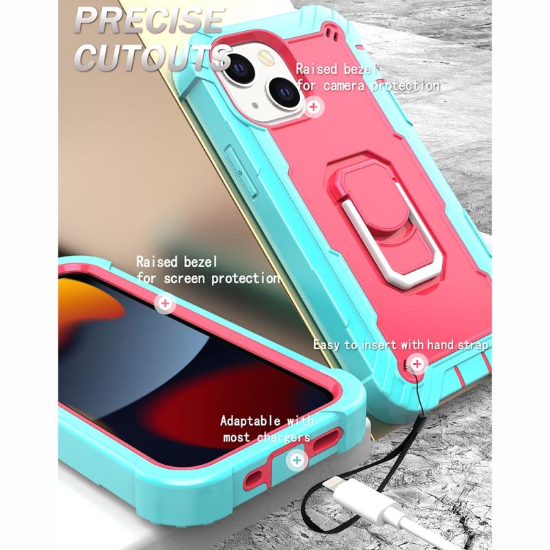 For iPhone 13 PC + Rubber 3-layers Shockproof Protective Case with Rotating Holder(Mint Green + Rose Red)