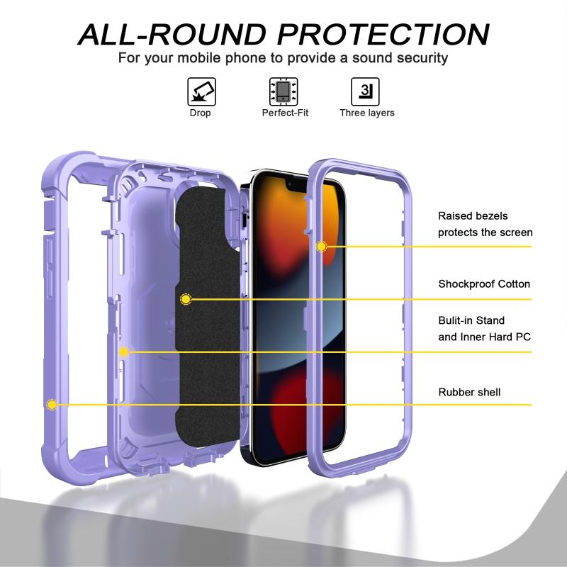 For iPhone 13 PC + Rubber 3-layers Shockproof Protective Case with Rotating Holder(Purple)