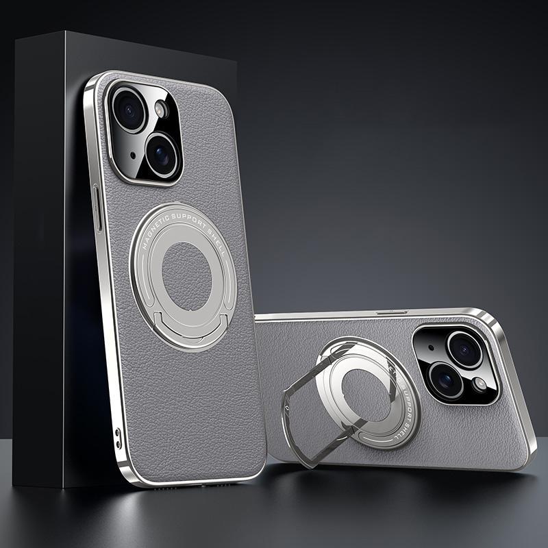 For iPhone 13 Plain Leather Hybrid Metal Holder MagSafe Phone Case(Grey)