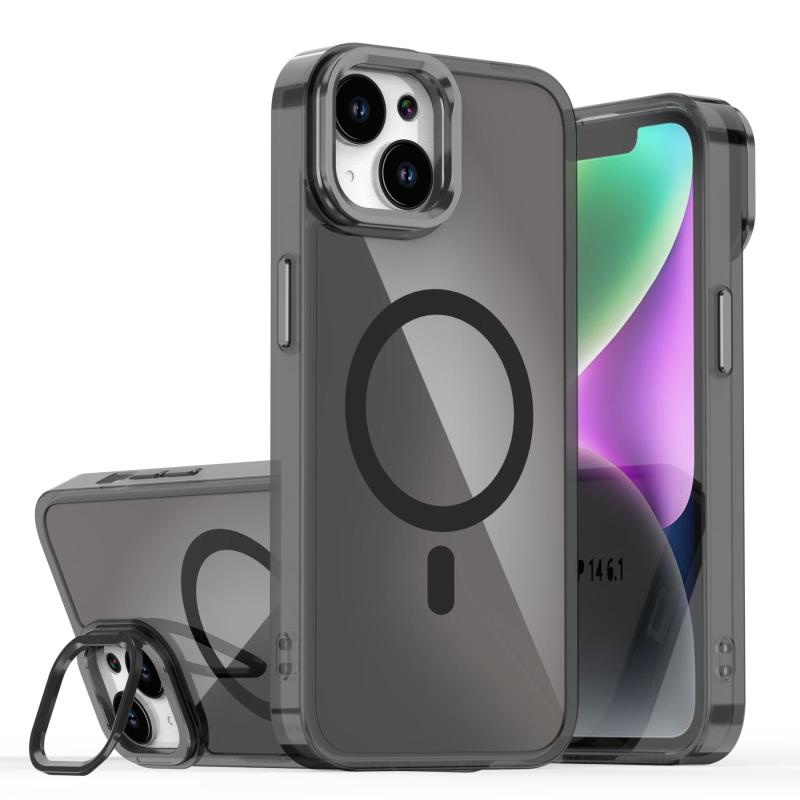 For iPhone 13 Plating Gradient Discolor MagSafe Phone Case with Holder(Black)
