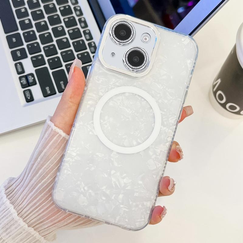 For iPhone 13 Plating Texture MagSafe TPU Phone Case with Glitter Lens Film(White Shell Pattern)