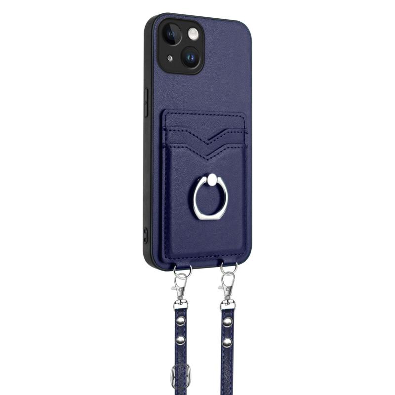For iPhone 13 R20 Crossbody Rope Ring Card Holder Phone Case(Blue)