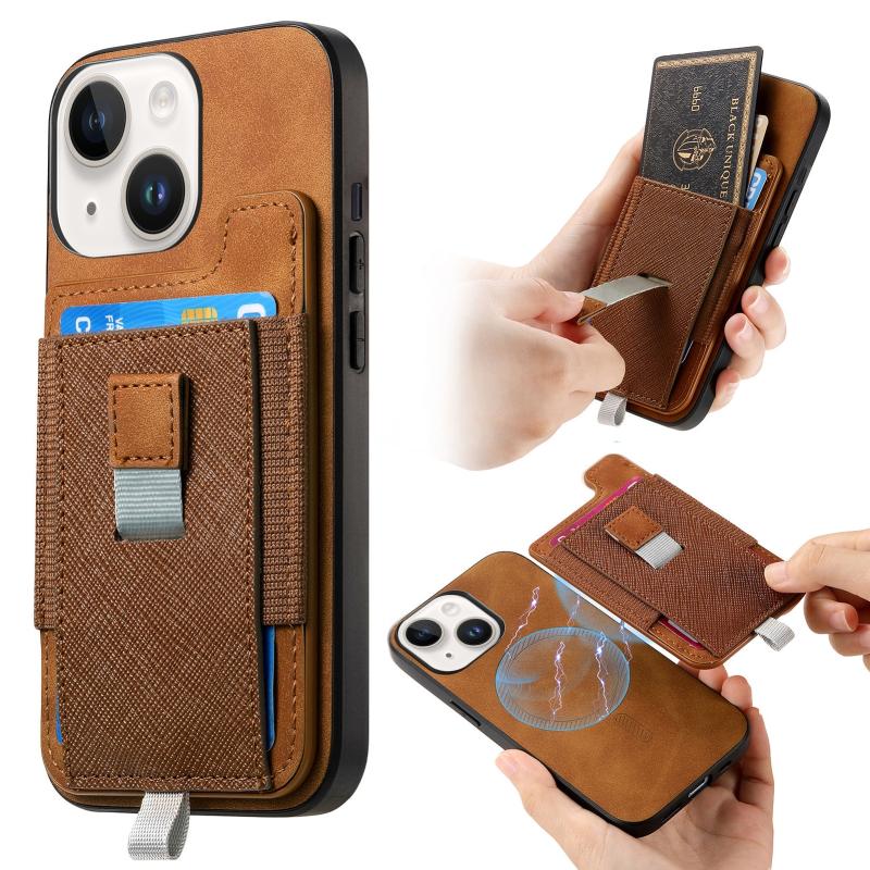 For iPhone 13 Retro Magsafe Cross Leather Pull-Out Card Bag Back Phone Case(Brown)