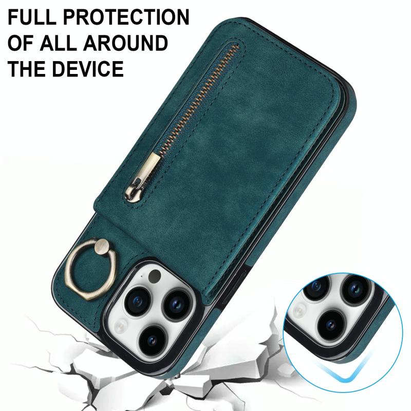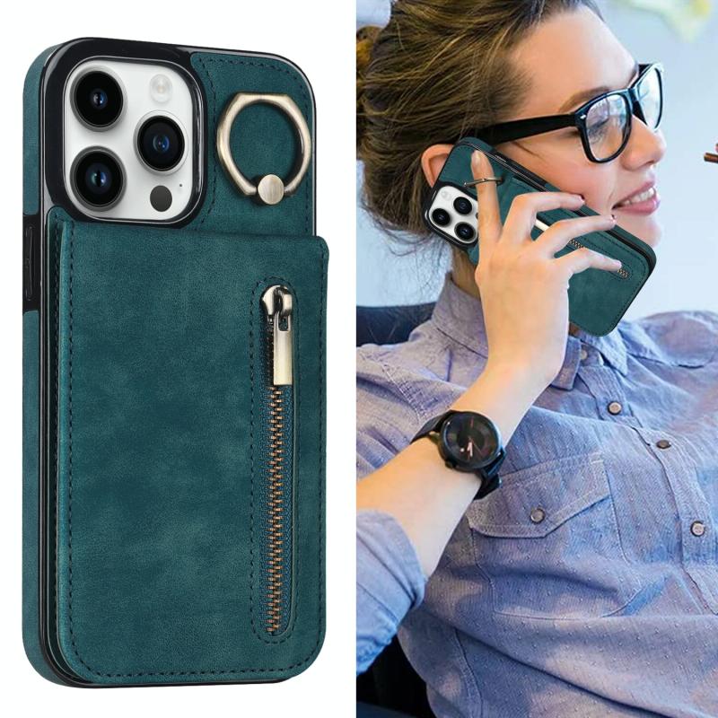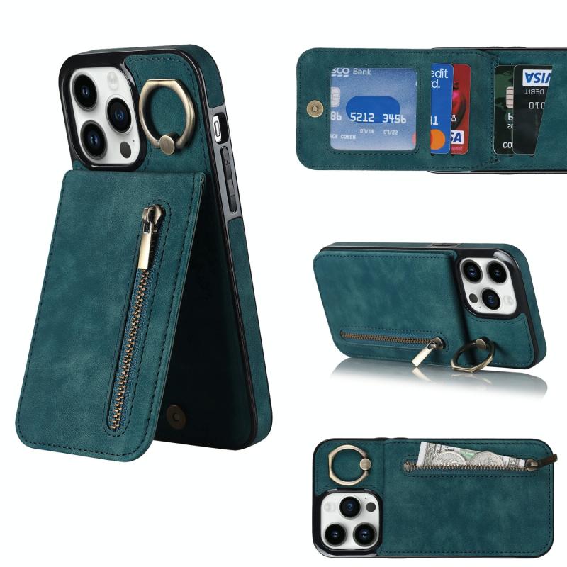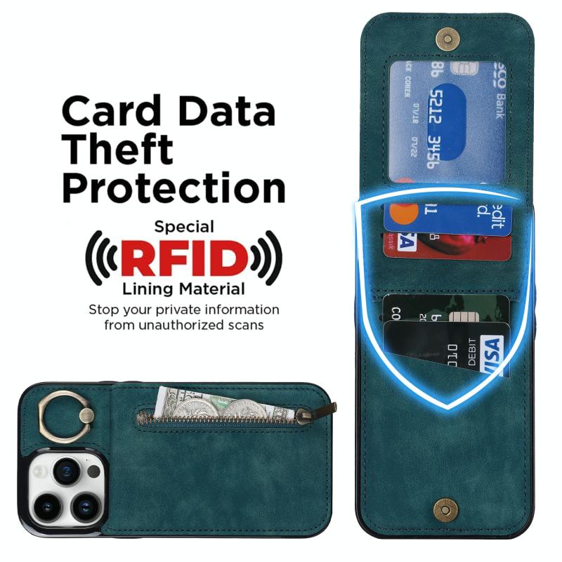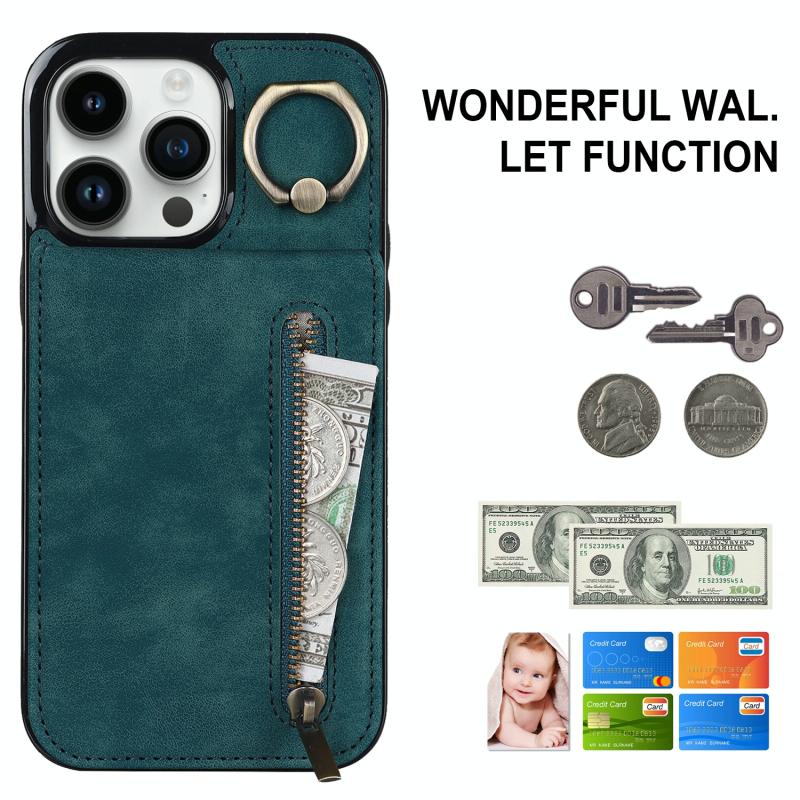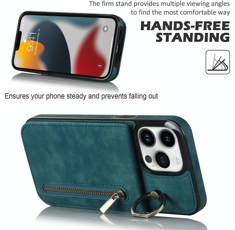 For iPhone 13 Retro Ring and Zipper RFID Card Slot Phone Case(Blue)