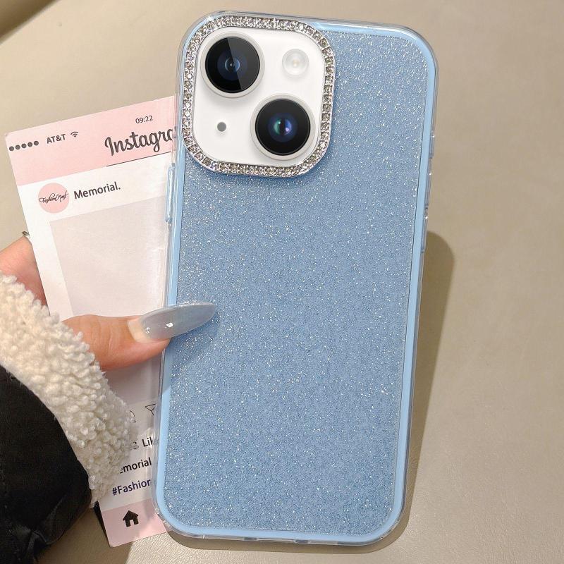 For iPhone 13 Rhinestone-Embedded Camera Frame Glitter Full Coverage Phone Case(Blue)