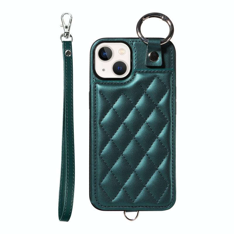 For iPhone 13 Rhombic Texture Card Bag Phone Case with Short Lanyard(Green)