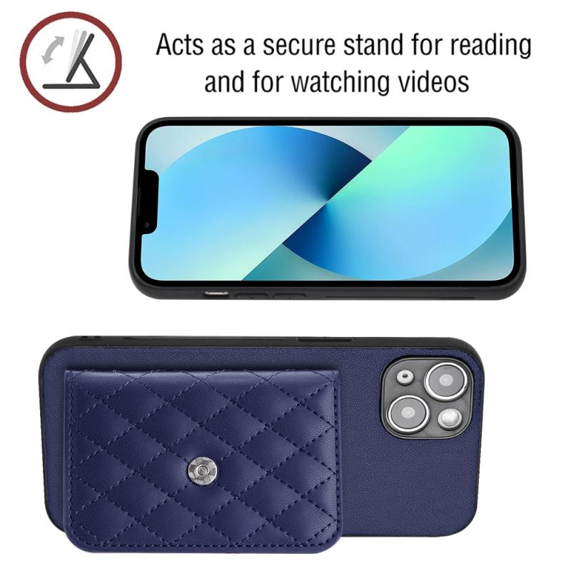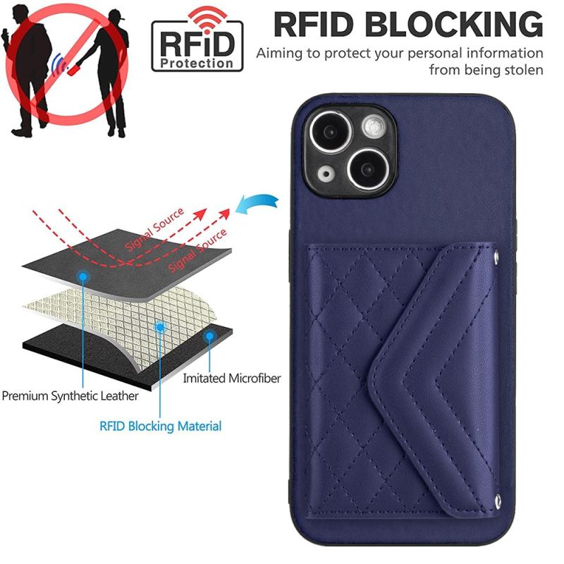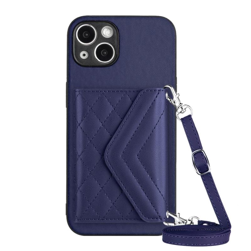 For iPhone 13 Rhombic Texture Card Bag RFID Phone Case with Long Lanyard(Blue)