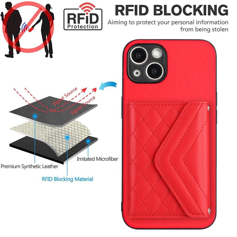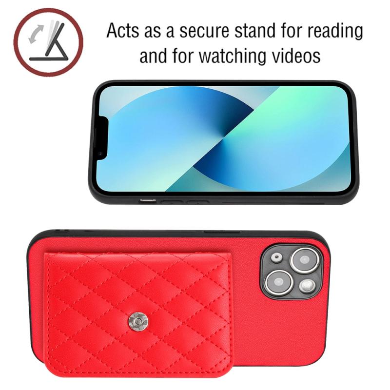 For iPhone 13 Rhombic Texture Card Bag RFID Phone Case with Long Lanyard(Red)