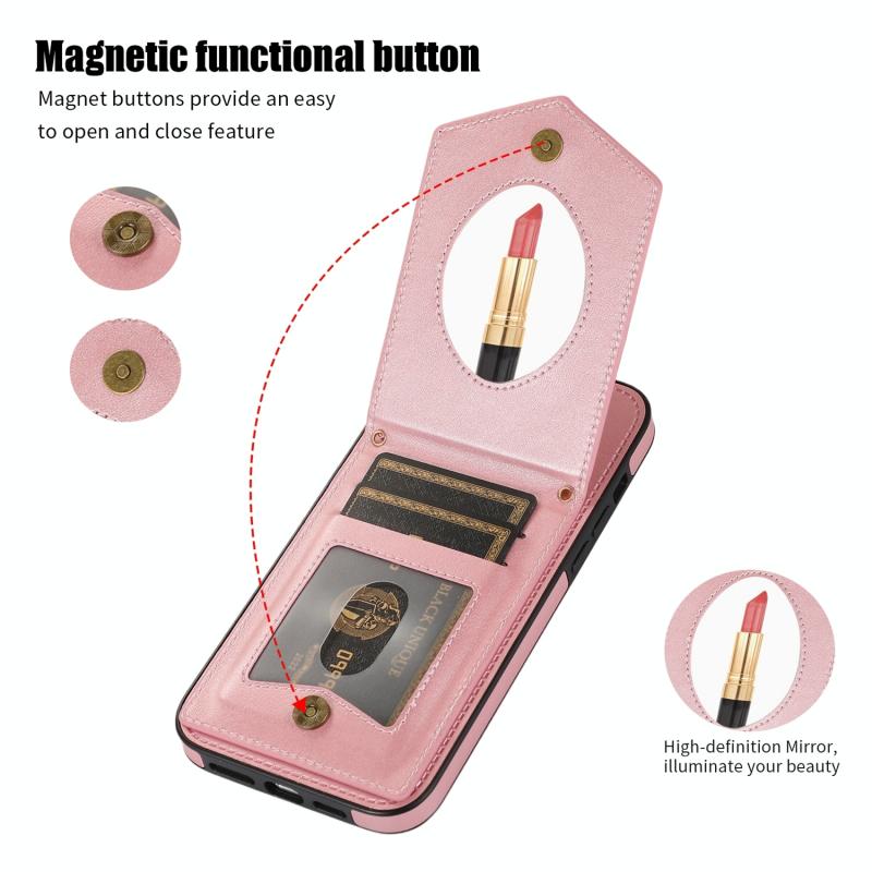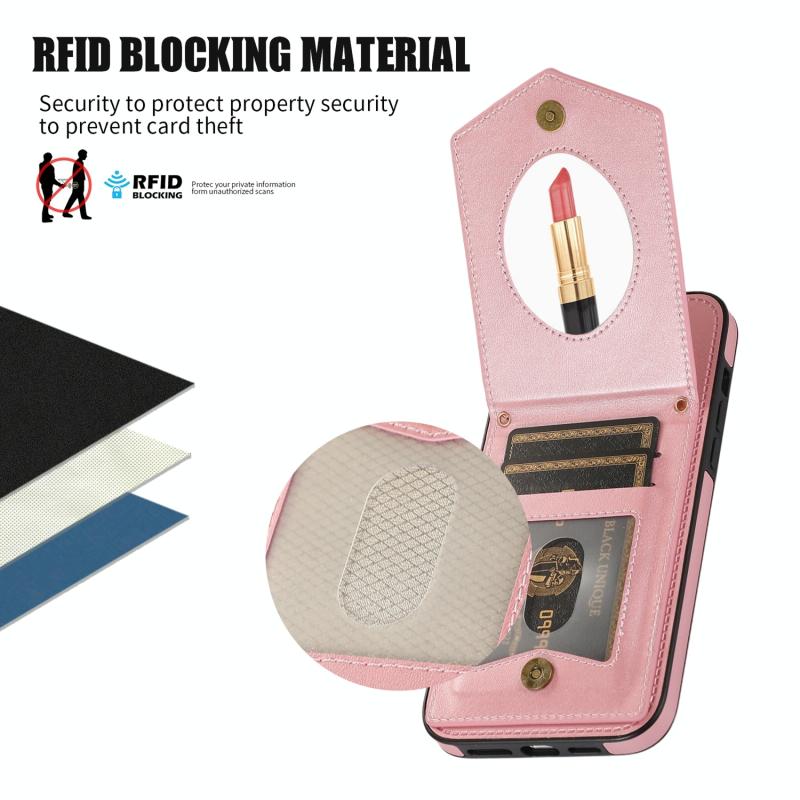 For iPhone 13 Rhombic Texture RFID Phone Case with Lanyard & Mirror(Rose Gold)