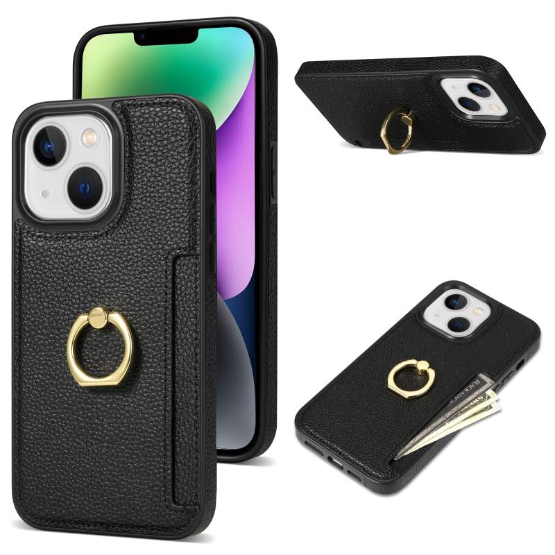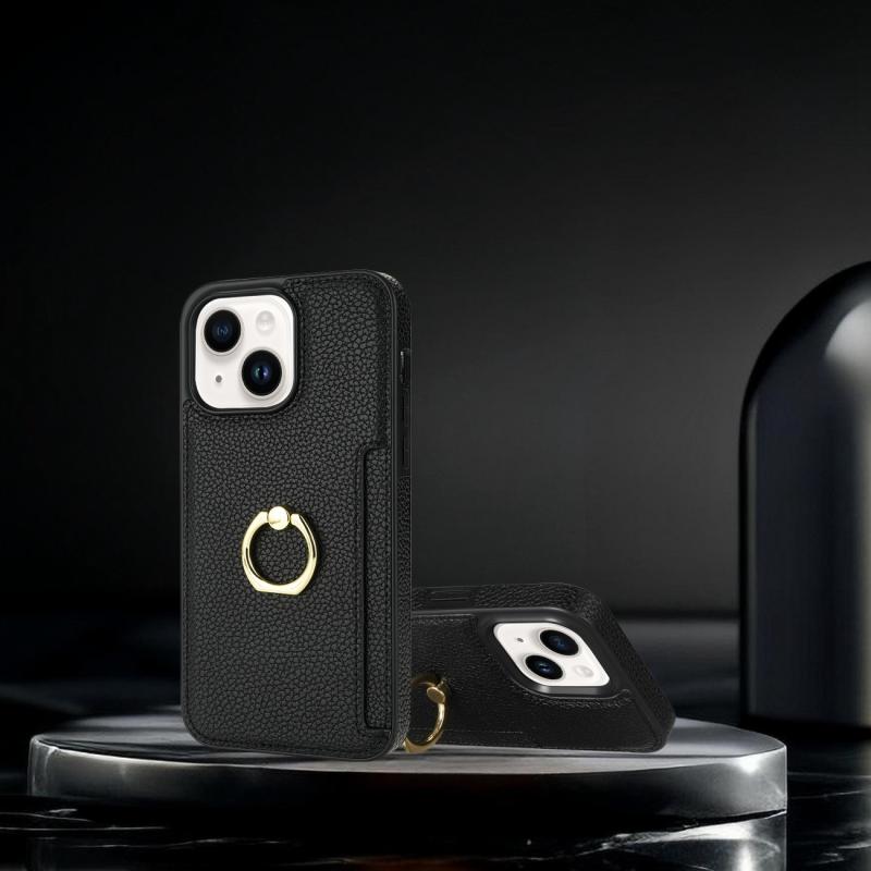 For iPhone 13 Ring Card Litchi Leather Back Phone Case(Black)