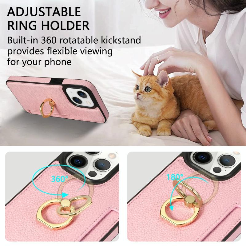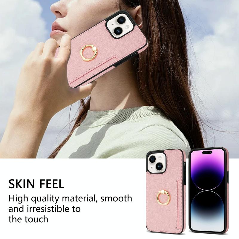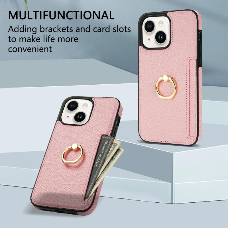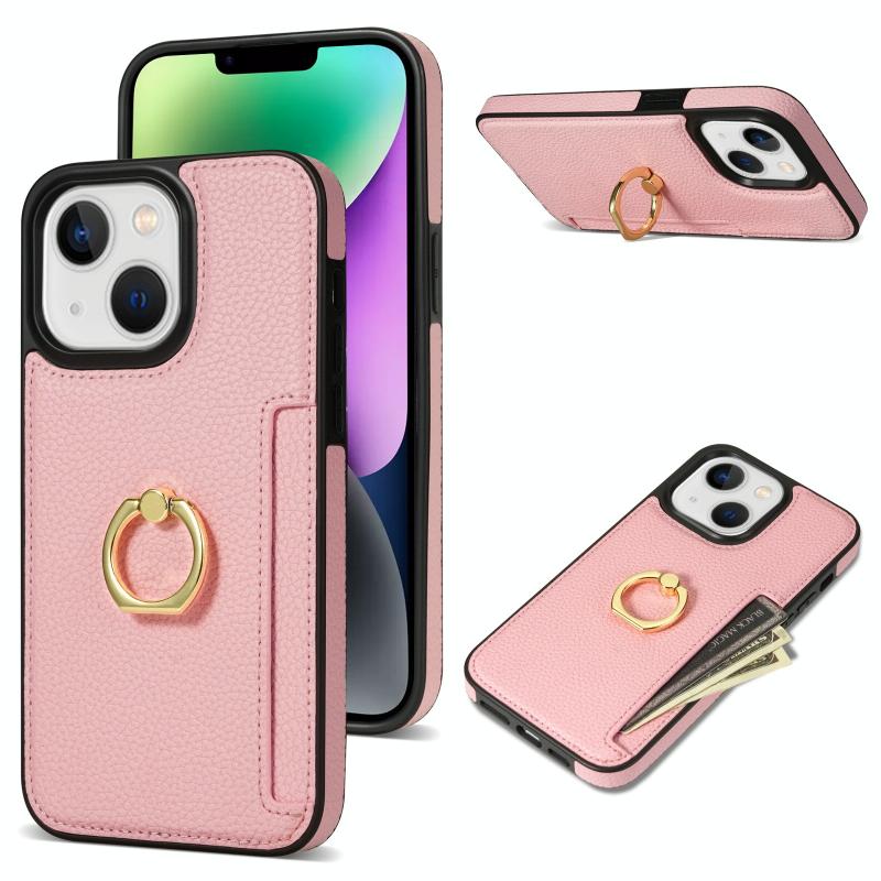 For iPhone 13 Ring Card Litchi Leather Back Phone Case(Pink)
