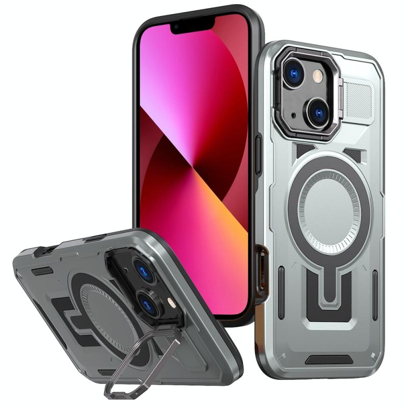For iPhone 13 Shield Hollow Frame Holder MagSafe Phone Case(Grey)