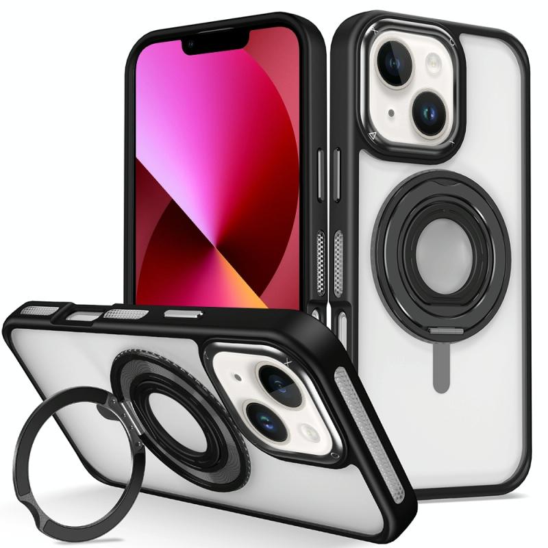 For iPhone 13 Skin Feel Transparent 360 Degree Rotating Silicone Ring Holder Phone Case(Black)