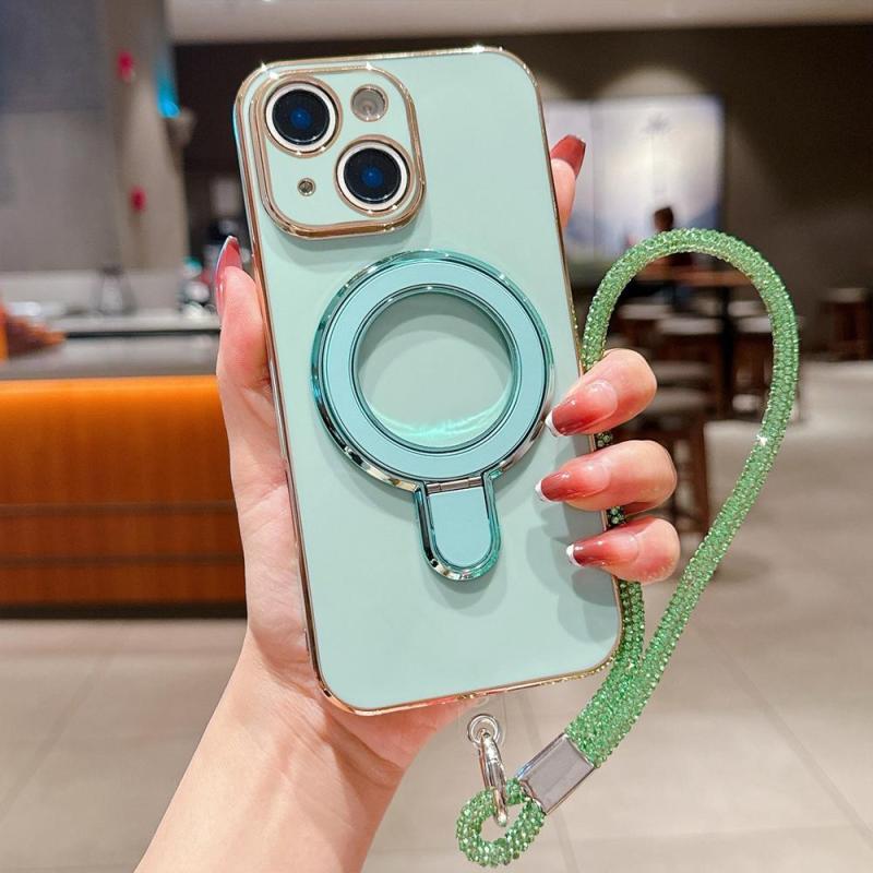For iPhone 13 Solid Color Electroplated Metal Holder Phone Case with Lanyard(Light Green)