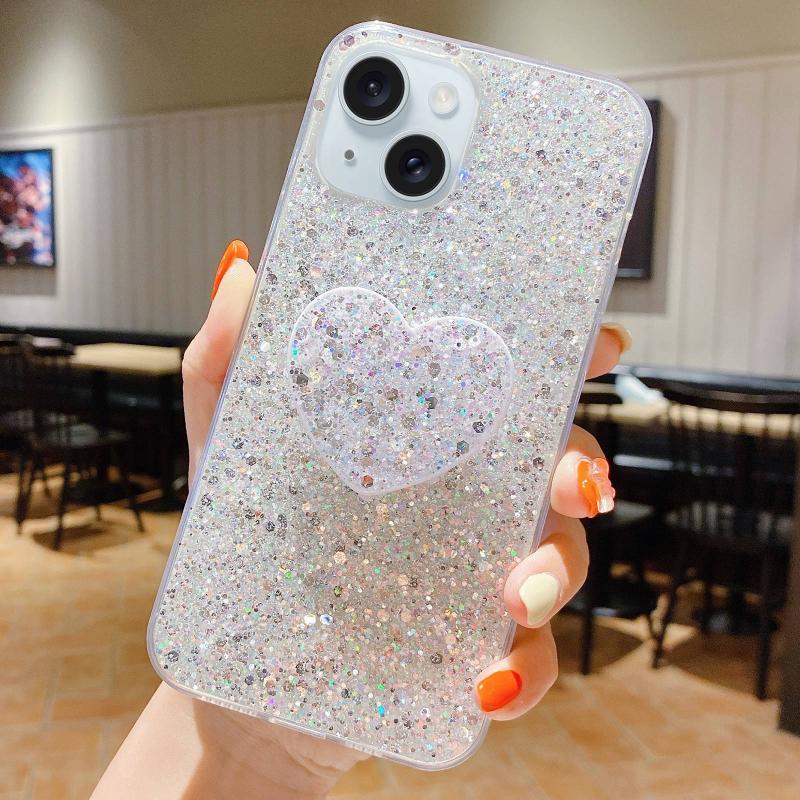 For iPhone 13 Starry Sequin Heart Stand Epoxy TPU Phone Case(Silver)