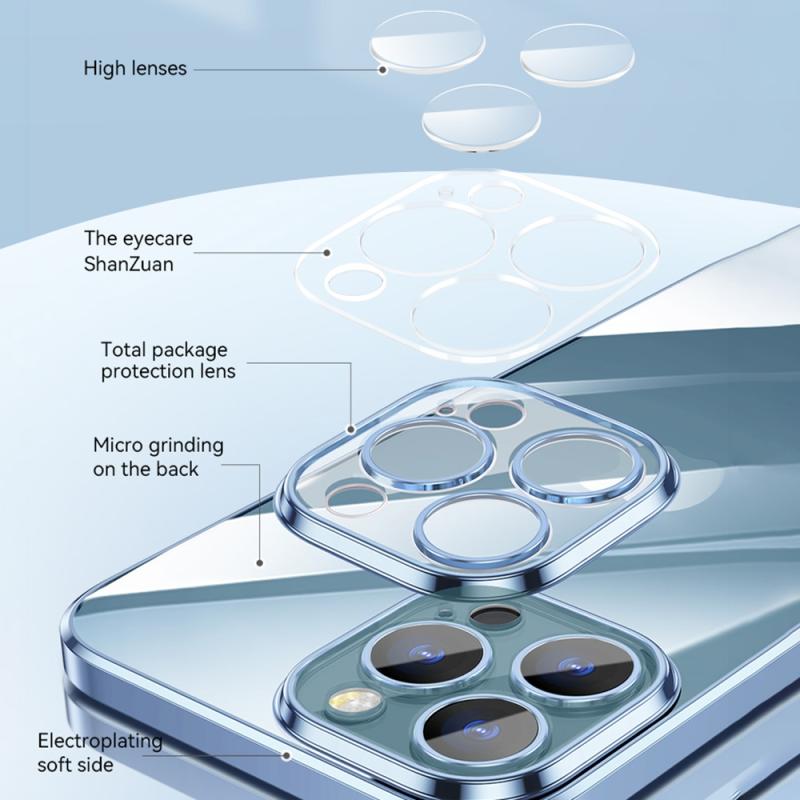 1. Electroplated TPU soft frame and clear hard back plate, with camera lens protector.