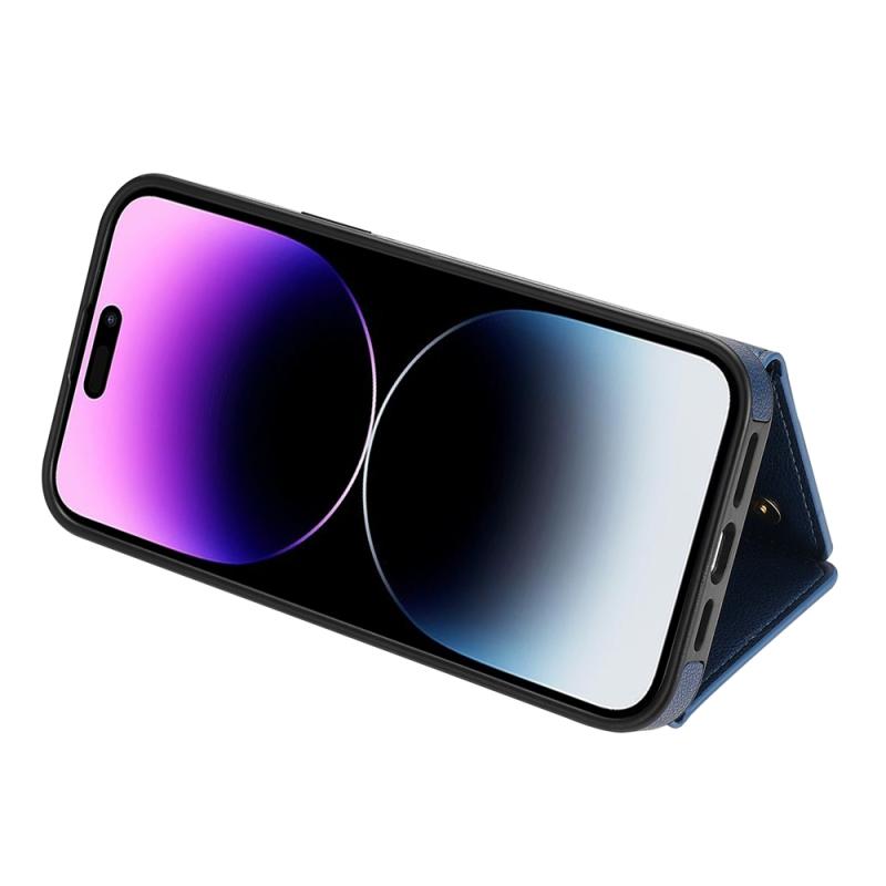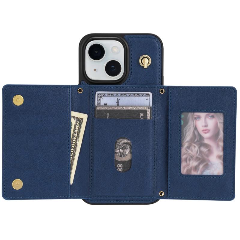 For iPhone 13 Three Fold Card Bag Phone Case with Long Lanyard(Blue)