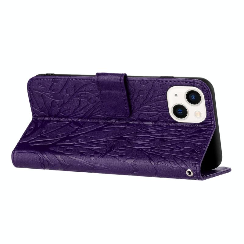 For iPhone 13 Tree Birds Embossed Pattern Leather Phone Case(Purple)