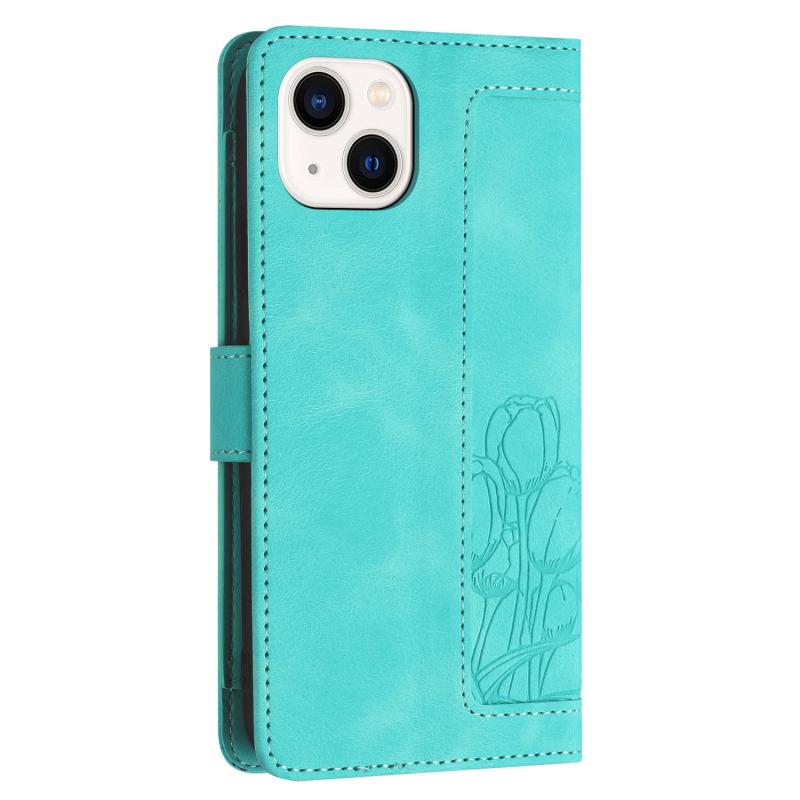 For iPhone 13 Tulips Embossed Leather Phone Case with Lanyard(Green)