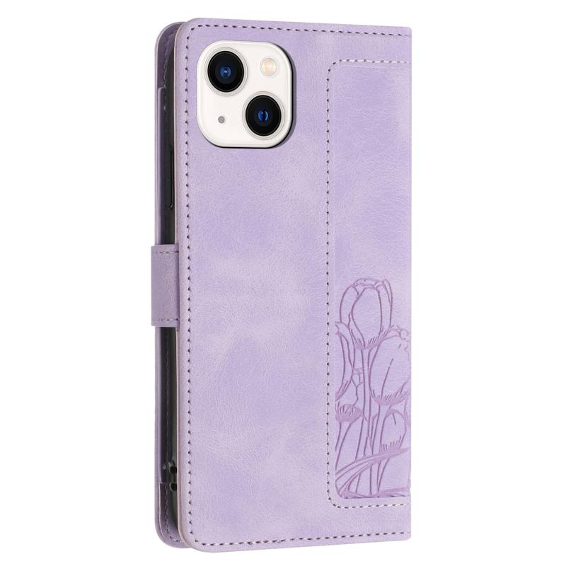 For iPhone 13 Tulips Embossed Leather Phone Case with Lanyard(Purple)